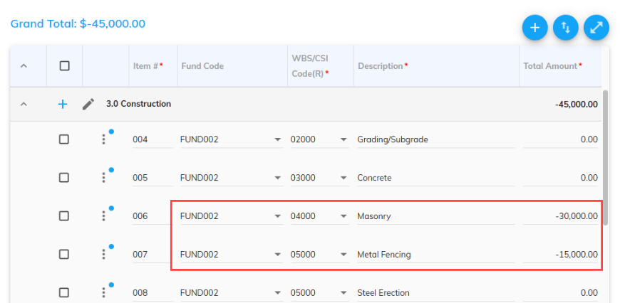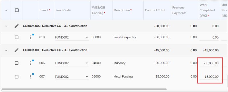 If a deductive change order was meant to reduce the amount that can be billed against a line from the original contract, then it’s recommended to “cancel” out these new line items in the following invoice.